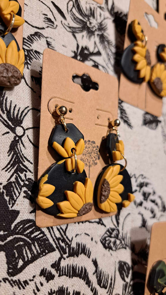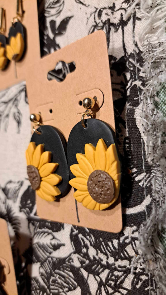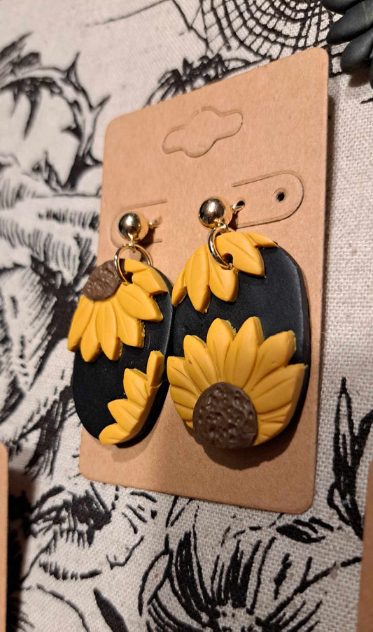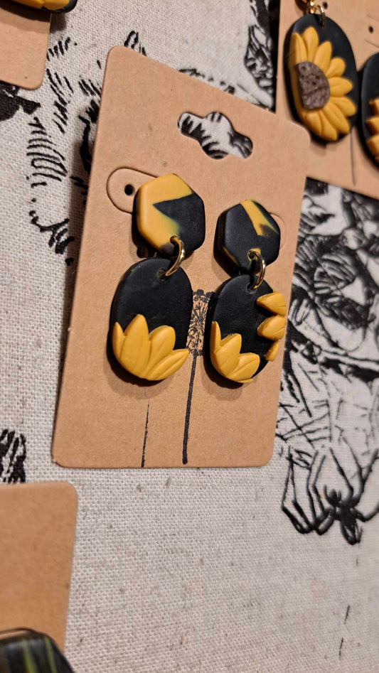 "Black Sunflower" Polymer Clay Dangle Earrings