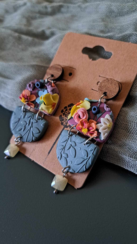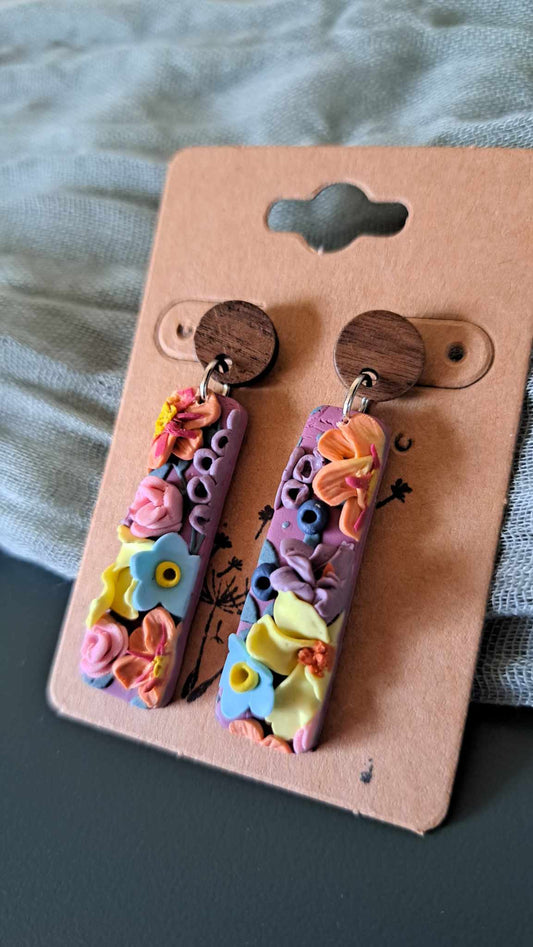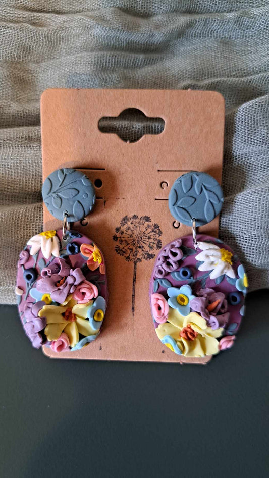 Handmade Oblong Flower Dangles Polymer Clay Earrings (B)