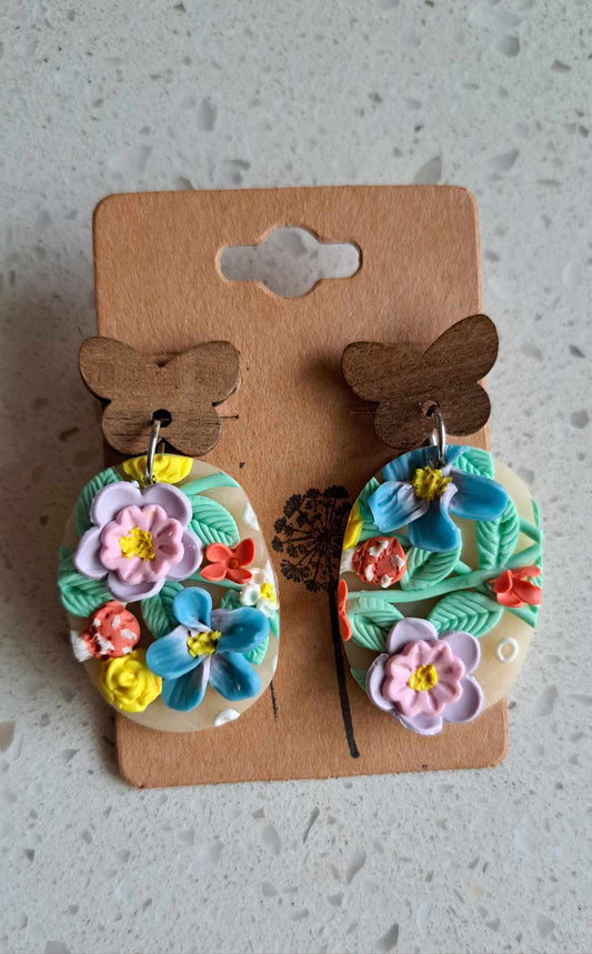 Handmade Oblong Pastel Flower Dangles Polymer Clay Earrings (C)