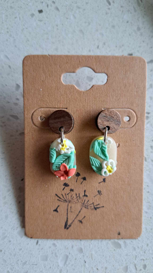 Handmade Small Oblong Flower Dangles Polymer Clay Earrings (F)