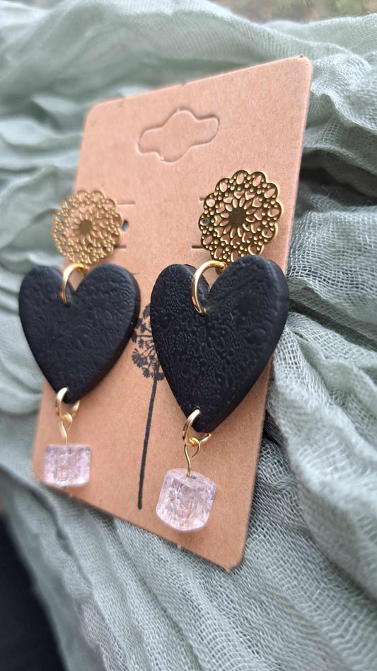 Black Heart Polymer Clay Dangle Earrings (B)