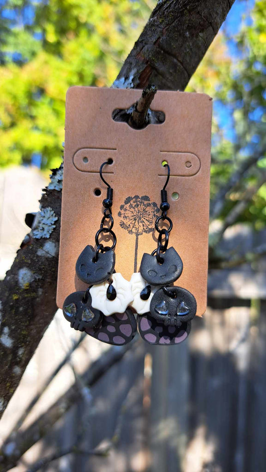 Polymer Clay Cat/Spider/Skull & Spots Dangle Earrings