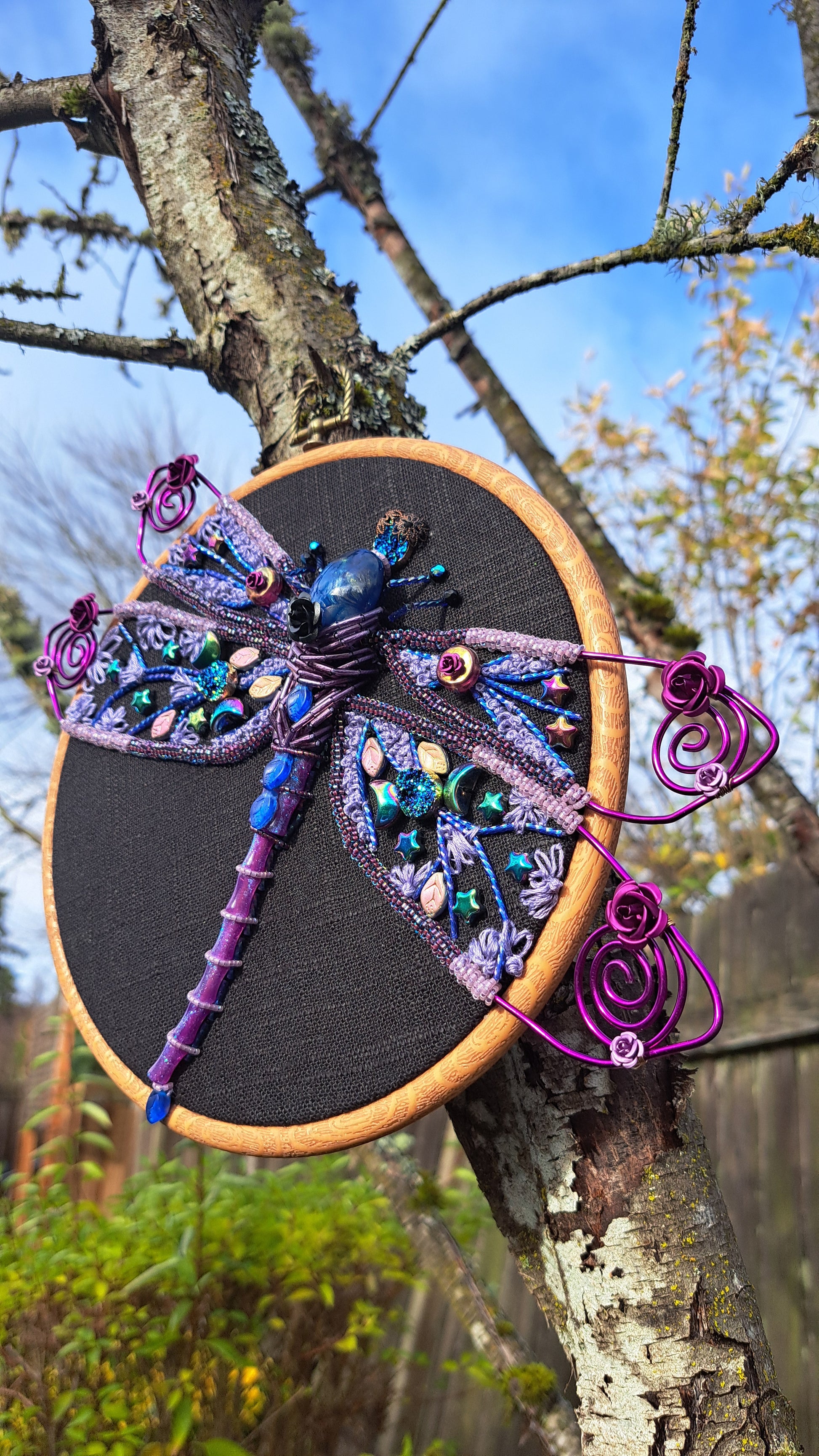 **I poured over 20 hours into creating this piece, carefully picking the perfect beads and wrapping the wire wing frame. I even hand-embroidered sparkling beads with embroidered designs to highlight the delicate charm of a dragonfly’s wings.**