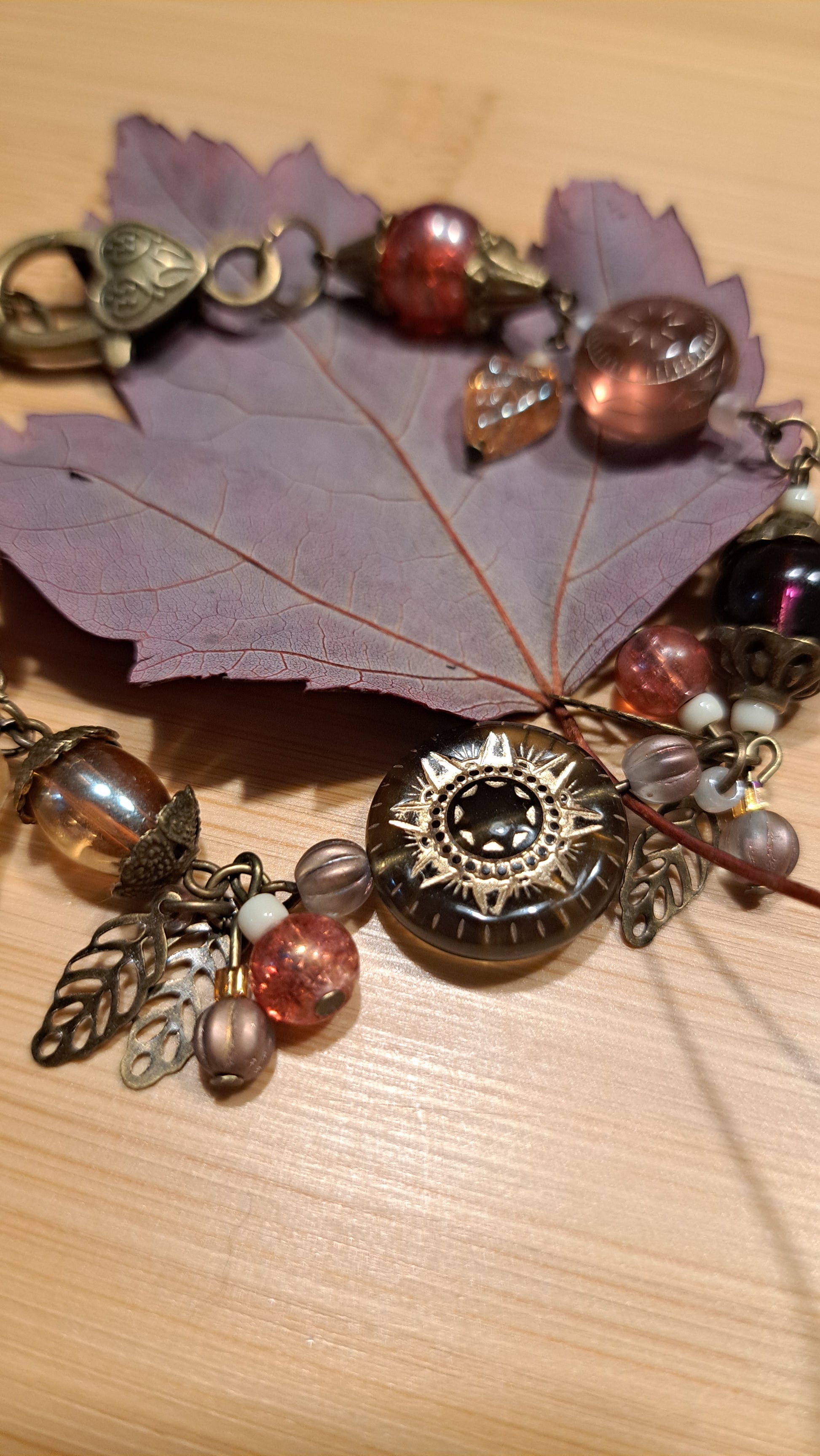- Beads Included: 10mm Milky Tan Glass Beads, 10mm Maroon with Gold Glass Beads, 10mm Oblong Champagne Beads, AB Orange Leaf Glass Beads, 6mm/10mm Berry Glass Beads, Czech Glass Beads for Small Mushroom on Extended Chain, Orange/ Green Flower, Purple Matte Rice Beads, White Czech Glass Beads, Acrylic Beads with Gold Decals